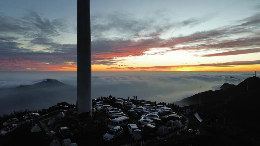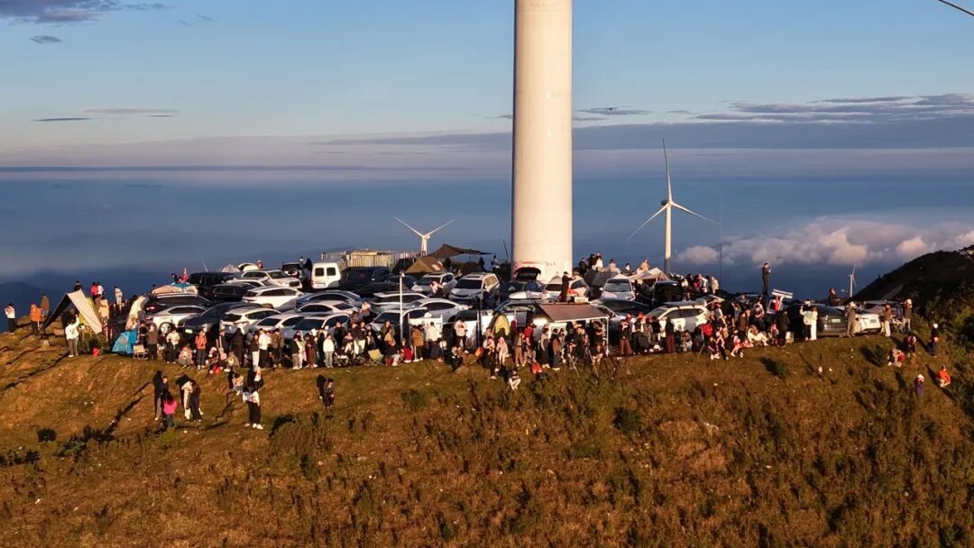 据游客分享及现场影像显示,上周末清晨,景区多个“风车”平台及山间公路旁停满了来自广州、深圳、珠海等珠三角地区及本地的车辆,主要观景平台人头攒动。游客们或架起“长枪短炮”捕捉美景,或通过抖音等平台进行直播,无人机在山间盘旋拍摄。当旭日东升,云海翻腾,现场惊叹声、欢呼声此起彼伏。不少游客赞叹道,站在高山之巅,看红日初升,巍巍群山云蒸霞蔚,脚下风生雾起,云海翻腾,云瀑奔涌,此情此景,令人叹为观止。